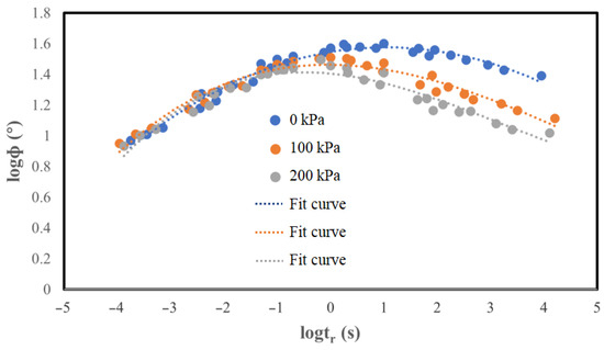 The phase angle main curve’s overall shape under the three confining pressures follows a clear hierarchy, and by increasing the confining pressure, the phase angle main curve tends to shift downwards. In other words, the magnitude of the phase angle is reduced by increasing the confining pressure. This can be attributed to the enhanced internal friction angle between the aggregates in permeable asphalt mixture resulting from the higher confining pressure, leading to a reduction in the phase angle.