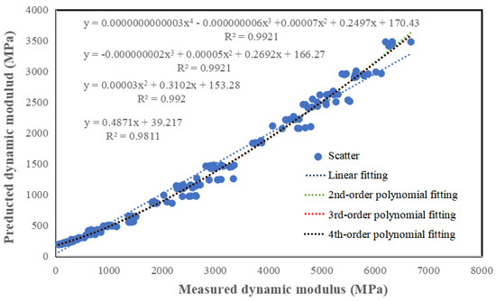 Figure 14 shows that the relationship between the predicted and measured values is very highly correlated using both linear fitting and polynomial fitting, with an R2 greater than 0.98, which is very reliable. By comparing the coefficient change of the highest order of the polynomial, it can be found that the coefficient value becomes very small with the increase in the order, so the relationship between the predicted and measured values can be expressed more accurately by using linear fitting. Therefore, the Hirsch model better predicts the permeable asphalt mixture dynamic modulus, but the predicted value needs to be corrected, and the expression of the correction is: y = 0.4871x + 39.217.