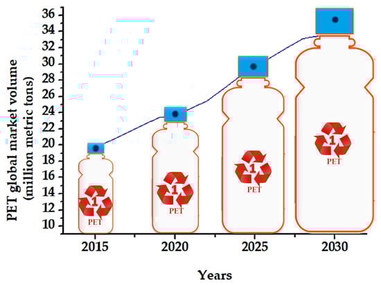 Hence, PET’s popularity as a packaging material stems from several properties, such as transparency, food safety, cleanliness, impact strength, UV resistance, durability, cost-effectiveness, and barrier properties [,,]. However, the increase in the world market volume over recent years (from 19 million metric tons in 2015 to approximately 25 million metric tons in 2022), as detailed in Figure 3, has had a detrimental effect on the environment. Most concerning is that the PET volume is expected to reach 36 million metric tons in 2030 []. As a result, during the processes of production, application, and disposal, significant amounts of PET have been released into the environment, and the accumulation of PET wastes is steadily rising, thus endangering ecosystems all over the world []. For example, it has been predicted that, out of every million PET plastic bottles sold globally every minute, more than 90% ultimately end up in landfills or the ocean, taking hundreds of years for PET to fully decompose in the environment [,]. In 2020, 7297.7 kilotons of PET were consumed worldwide, with just 23% recycled, 35% incinerated, and 44% landfilled or disposed into the environment, according to a study conducted across 12 global regions (41 countries that, together, manufacture over 95% of the world’s PET) []. Also, through partial decomposition, PET-derived microplastics indeed become prevalent in aquatic and marine ecosystems. Subsequently, these micropollutants, as bigger fragments and microplastics, are consumed by living organisms, inducing health issues [].