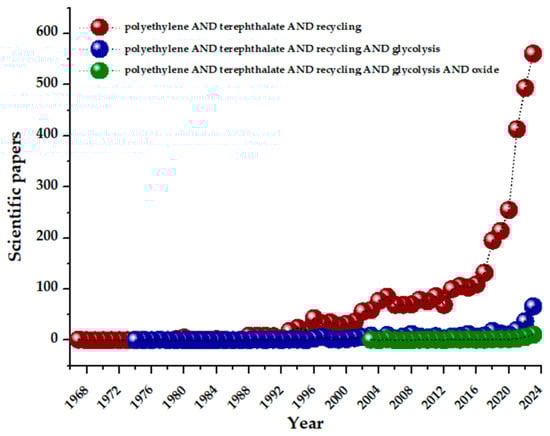 Scientific papers published from 1967 to 2023 (Scopus search on 23 January 2024) containing “polyethylene terephthalate”, “recycling”, “glycolysis”, and/or “oxides” in title, abstract, or keywords.