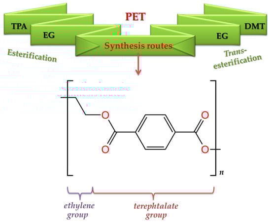 Synthesis routes for PET by esterification and trans-esterification and representation of repeating structural unit in the polymer chain (according to [,]).