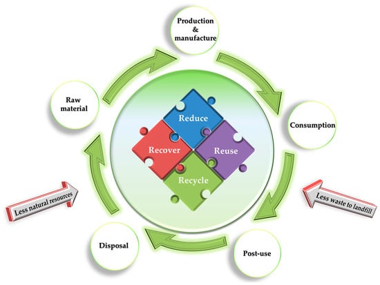 Recently, the 9R and 10R frameworks aimed to optimize social, material, and economic values, with a particular emphasis on the environmental aspect (Table 1). In order to minimize plastic waste, Kassab et al. are considering an extension of the 6R framework (reduce, reuse, recycle, repair, refuse, and rethink) to a comprehensive 9R framework, incorporating refurbish, remanufacture, re-purpose, and recover strategies. For instance, the remanufacturing of ocean-retrieved PET waste or post-consumer PET bottles has been explored using various technologies, including injection molding, 3D printing, and thermoforming [].