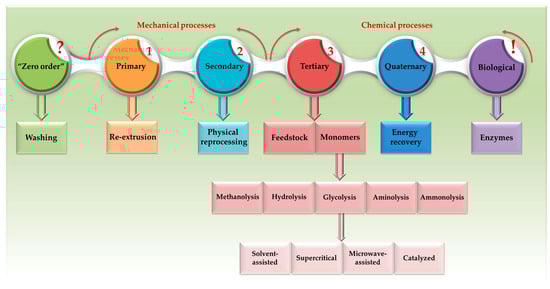 As a result, Figure 8 depicts the PET recycling methods (including the concept of “zero order”), which are briefly discussed further. It can be noted that both primary and secondary recycling rely on mechanical procedures, whereas tertiary and quaternary recycling are both based on chemical processes. Xin et al. (2021) categorize biological recycling as a type of chemical recycling []. Given that biological recycling encompasses enzymatic reactions and entails a fundamental chemical transformation of PET, it can be considered properly classified as a chemical process (Figure 8). By contrast, the “zero-order” method was considered a mechanical recycling only because the material is reused without altering its chemical structure (similar to primary and secondary recycling).