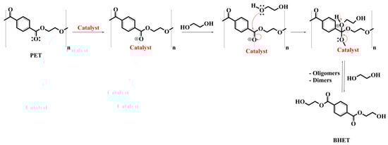 As shown in Figure 9, glycolysis entails incorporating ethylene glycol (EG) into PET chains, resulting in the production of bis(2-hydroxyethyl)terephthalate (BHET), along with dimers and oligomers. This usually occurs at temperatures between 180 and 240 °C and in the presence of a catalyst []. However, this method may also employ other glycols, like diethylene glycol (DEG) and propylene glycol (PG). In the case of using PG, the resulting products can include bis(2-hydroxypropyl) terephthalate (BHPT), BHET, and hydroxypropyl–hydroxyethyl terephthalate [], as evidenced in Table 2.