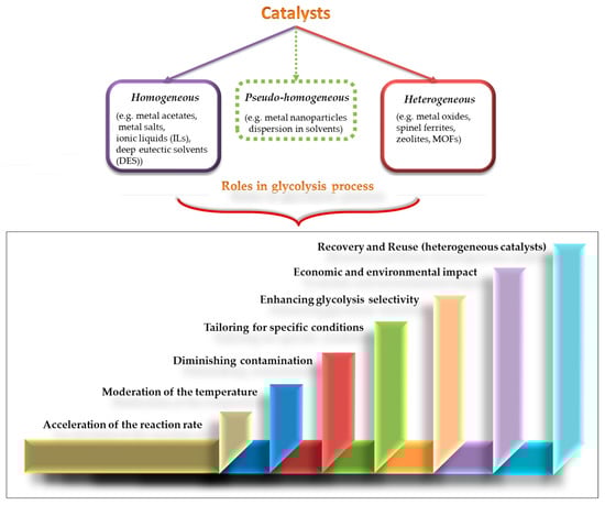 Glycolysis offers several advantages, including simplicity, operation at atmospheric pressure and relatively low temperatures, and low volatility and non-toxicity of glycolysis reagents and products (especially the monomer BHET). In addition, it avoids the generation of acid or alkali wastewater and allows for ease of separation and purification (by hot-water extraction, cooling crystallization, and adsorption) []. This process yields high quantities of BHET that can be directly used in the synthesis of new recycled PET (rPET). However, the kinetics of PET glycolysis reveal that the process is exceedingly slow without a catalyst, and achieving complete depolymerization to BHET is not feasible. In addition to the BHET monomer, the final mixture contains secondary products, specifically oligomers, making the recovery of BHET challenging []. Furthermore, glycolysis may not be suitable for low-quality PET waste and could be limited in the recovery of valuable monomers []. Thus, the glycolysis process was investigated by different methods and was classified accordingly in solvent-assisted glycolysis, supercritical glycolysis, microwave-assisted glycolysis, and catalyzed glycolysis [], as previously represented in Figure 8.