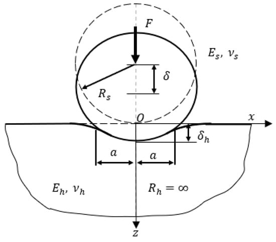 The center displacement of the elastic–plastic half-space is and the center displacement of the elastic sphere is , with the total displacement . The analytical solution of the above elastic contact can be solved by Hertzian theory [49].