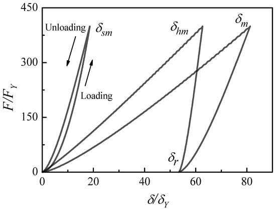The loading phase ends at a maximum load and generates the maximum deformation , and . Once the displacement is known, the unloading law of Equation (19) can be obtained by Equations (23) and (24).