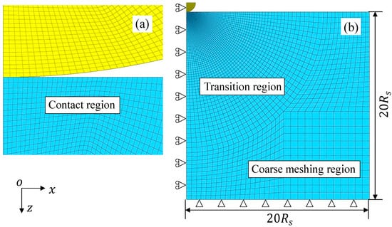 A typical isoperimetric rectangle axisymmetric 2-D element PLANE182 with four nodes is used to improve the efficiency of computation. In Figure 3a, the dense and regular elements are meshed around the contact area to obtain accurate results. In other regions, the element size is gradually changed for high computational efficiency, as can be seen in Figure 3b. For the contact conditions, Targe169 and Contact 171 elements are employed and the elements in the contact region are more than 50 to obtain an accurate contact radius. To deal with the high nonlinearity of the contact and finite plastic deformation, an iterative scheme of the full Newton–Raphson method is used to enhance the accuracy of the convergence solution [51]. The convergence criterion is controlled by the contact force. The convergence tolerance is 0.001 and the Euclidean norm (L2 norm) is used. For the boundary conditions, the boundary of the half-space is restricted in movement and the axis of symmetry can move vertically [52]. The hemisphere is loaded against the half-space by displacement control.