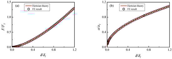 To verify the accuracy of the above FE model, a purely elastic contact simulation is performed in Figure 4 and compared with the Hertz theory. It indicates that the FE solutions are in good coincidence with the theoretical solutions for contact radius and contact force. The error of the FE contact force to the Hertzian solution is less than and the error of the FE contact radius to the Hertzian solution is less than . To obtain higher precision in small indentations, the smaller contact area can be re-meshed to obtain the required computational accuracy.