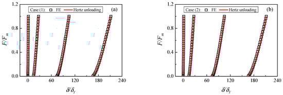 Validations of Hertzian unloading law: (a) material case (1), (b) material case (2).