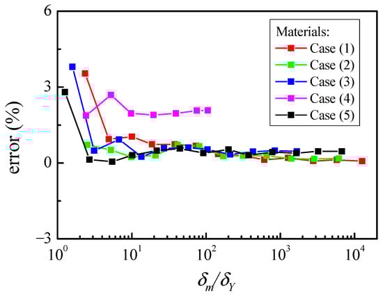 After fully unloading from elastic–plastic contact, the permanent deformation will exist and part of the energy is converted to plastic deformation. It is significant to calculate the residual indentation for unloading and reloading. Figure 6 shows the errors of the residual indentation between the FE results and the solutions (Equation (23)) for different maximum indentations with the five materials in Table 1.
