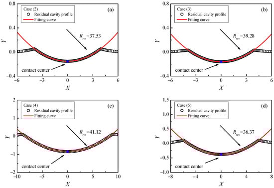 After fully unloading from elastic–plastic contact deformation, the permanent deformation occurs on the contact surface of the half-space. The surface of the residual contour can be approximated as a sphere with a curvature radius . Figure 7 shows the unloading residual deformation profile for four kinds of indentation contact cases in Table 1.