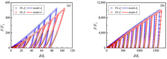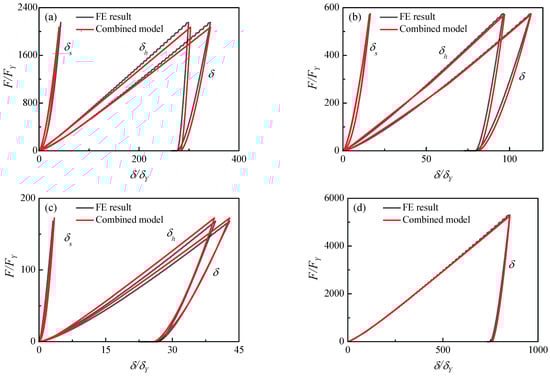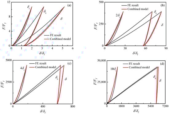 The unloading law (Equation (19)) can be validated by FE results. The unloading contrast of the contact force and the contact indentation , and are plotted in Figure 8 for the elastic and elastic–plastic material case (2) in Table 1. Four unloading curves from different maximum indentations , , and are obtained and shown in Figure 8a–d, respectively. It is noted that the loading curve is on the right and the unloading curve is on the left for the elastic hemisphere.
