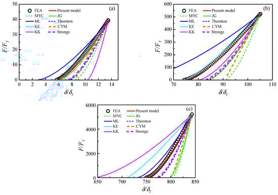 Comparisons of unloading models and the FE result with different maximum indentations for material case (3): (a) , (b) , (c) .