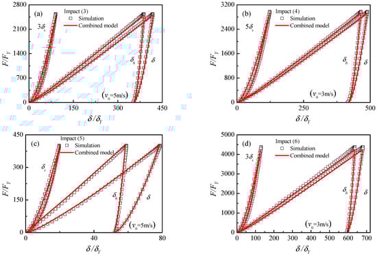 Figure 12 presents the simulation and calculation curves of impact force versus , and for the impact cases (3–6) with 3 and 5 m/s. To compare the results clearly, the indentations of the elastic sphere are magnified several times. The comparisons show perfect coincidence between the prediction and simulation results. It illustrates that the combined model can be employed for the low-velocity impact of elastic–perfectly plastic materials.