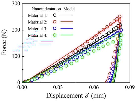 Figure 13 shows the comparisons of the indentation test results and the present combined models. In the loading process, good coincidences can be observed for Materials 1–3 and a small deviation is observed for Material 4. In the unloading process, the permanent deformation predicted by the combined model is slightly larger compared with the indentation test results. The deviations can be attributed to the additive manufacturing process, as additive manufactured materials are heavily affected by residual stresses, which cannot be accounted for in the present model. Therefore, the predictions of the combined model can be applied to the nanoindentation test.