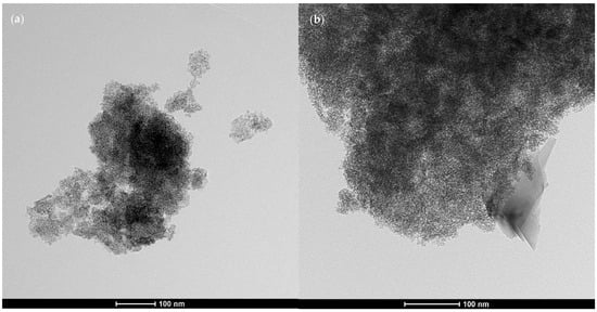 Morphology of agglomerated nanometric photocatalytic materials used in the study: TiO2 (A)—micrograph (a); TiO2 (B)—micrograph (b). TEM analysis performed on copper grids covered with a carbon film (microscope—TEM Tecnai TF 20 X-TWIN; parameters—EDAX, voltage 200 kV, STEM images collected using the HAADF detector).