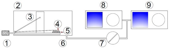 A schematic diagram of the experimental setup applied in the research of particle size analysis: (1) HEPA filter, (2) plexiglass chamber, (3) crockmeter, (4) grinding cloth, (5) tested sample, (6) air with particle inlet, (7) flow meter, (8) Scanning Mobility Particle Sizer, (9) Aerodynamic Particle Sizer.