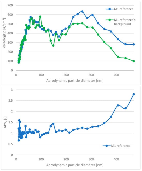 A trend was observed for all analyzed sample variants, where the APV for the TiO2-modified samples was lower than for the reference samples. The highest emittance levels were observed for grains of approx. 1.0 to 5.0 µm, especially for reference variants (Figure 5, Figure 6, Figure 7 and Figure 8).