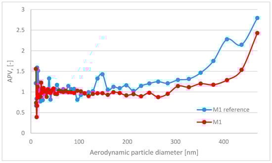 Comparison of grain diameter distribution for grains emitted during the abrasion test. APV values for mortar sample M1—reference (blue) vs. TiO2-modified samples (red) for grain diameters of 10.4 ÷ 469.8 nm.