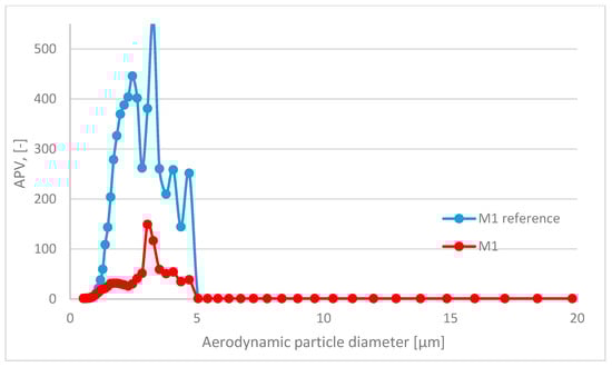 Comparison of grain diameter distribution for grains emitted during the abrasion test. APV values for mortar sample M1—reference (blue) vs. TiO2-modified samples (red) for grain diameters of 0.523 ÷ 19.810 μm.