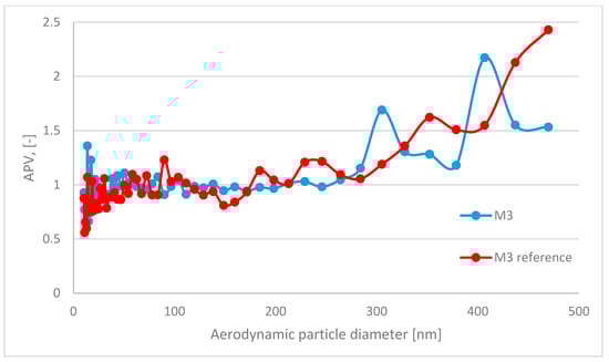 Comparison of grain diameter distribution for grains emitted during the abrasion test. APV values for mortar sample M3—reference (blue) vs. TiO2-modified samples (red) for grain diameters of 10.4 ÷ 469.8 nm.
