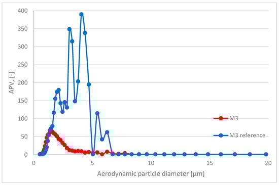 Comparison of grain diameter distribution for grains emitted during the abrasion test. APV values for mortar sample M3—reference (blue) vs. TiO2-modified samples (red) for grain diameters of 0.523 ÷ 19.810 μm.