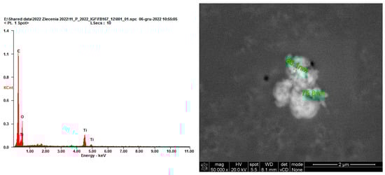 SEM micrograph of a grain of agglomerated TiO2 nanocrystallites mobilized from cementitious mortar (M1)—confirmation of chemical composition presented through an EDS analysis; the entire agglomerate had a diameter of approx. 1.50 µm.