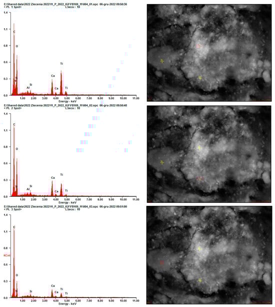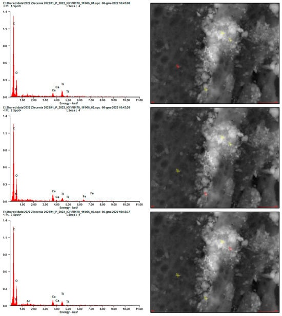 EDS analysis for different mobilized grains presented in an SEM micrograph in Figure 11; all EDS signals indicate a mix of various compounds at the exact location (red marker)—grains consisting of hydration products with TiO2 grains embedded within.