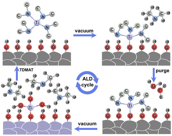 Figure 1 schematically illustrates the preparation procedure of the TiO2 layer by ALD method. After an initial water vapor bath pulse to hydroxylate the surface, TDMAT, which is a titanium precursor, is forced into the reaction chamber. TDMAT reacts directly with the hydroxyl groups of the LiCoO2 particles to form Ti-O-CH3 and NH-C2H6. Excess titanium precursor and NH-C2H6 are removed by vacuum. In parallel with the water vapor purge, as a source of oxygen reaction, the powder is placed in steam to hydrolyze LiCoO2 and the surface layer of the titanium precursor Ti-O-CH3 so as to form -Ti-OH and NH-C2H6. By repeating this sequence, TiO2 coating layers could be gradually formed on LiCoO2 particles.