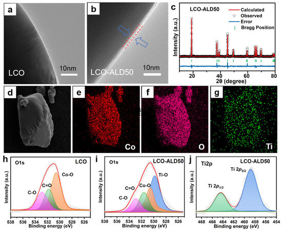 TEM images of (a) bare LCO and (b) LCO-ALD50 after TiO2 coating. (c) XRD patterns of LCO-ALD50 with Rietveld refinement. (d) FESEM image of LCO-ALD50 and the corresponding EDS images with elements (e) Co, (f) O and (g) Ti. High-resolution O1s XPS spectra of bare (h) LCO and (i) LCO-ALD50. (j) High-resolution Ti2p XPS spectra of LCO-ALD50.