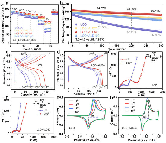 The Nyquist plots of bare LCO and LCO-ALD50 with the equivalent circuit models are shown in Figure 3e and Figure S7. The fitting results are shown in Table S2. The intercept of the curve with the x-axis is the internal resistance (Rs) of the electrolyte and the electrode [29,30]. The semicircle and the diagonal line indicate the charge transfer resistance (Rct) and the Warburg impedance (Zw) [31]. The Rct values of LCO-ALD50 before cycling and after 300 cycles are determined to be 352.4 and 189.2 Ω, respectively, which are smaller than those of bare LCO (863.2 and 382.7 Ω). The smaller Rct indicates less resistance to mass transfer at the interface of electrode/electrolyte, which can be attributed to the reduced surface structural degradation because of TiO2 coating [32]. Figure 3g,h show the cyclic voltammetry (CV) curves for the first ten cycles of bare LCO and LCO-ALD50 measured at 0.1 mV s−1. There is a pair of redox peaks at about 3.8 and 4.1 V for both samples, corresponding to the redox reactions of Co3+/Co4+ during Li+ insertion and extraction [5]. The LCO-ALD50 electrode exhibits a lower polarization voltage (ΔE = 0.20 V) in the first cycle than that of the bare LCO electrode (ΔE = 0.37 V). What is more, the CV curves almost overlap throughout the cycles, further confirming the good electrochemical reversibility of the LCO-ALD50 electrode.