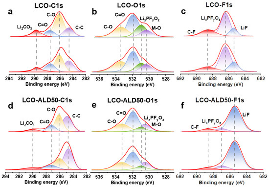 Investigation of the excellent surface stability of bare LCO and LCO-ALD50 at 4.5 V. XPS depth spectra of (a) C1s, (b) O1s, and (c) F1s for bare LCO and of (d) C1s, (e) O1s, and (f) F1s for LCO-ALD50 after 100 cycles at 1C.
