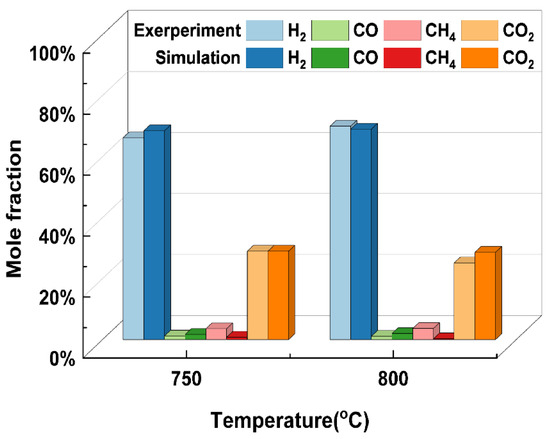 It is first necessary to verify the accuracy of the model before using the thermodynamic model developed above for further analyses of the reliability of the results obtained from the thermodynamic model. Many researchers have carried out supercritical water gasification experiments using glycerol as a model compound for biomass [31,37]. This paper selected glycerol SCWG conducted by Byrd et al. [38] as the material for validation due to the lack of access to experimental work on the SCWG of rice straw. Figure 1 shows that the simulation results can be well-supported by the experimental results to indicate the feasibility of the model. It is worth noting that liquid intermediates are ignored in the SCWG thermodynamic model developed in this paper. Glycerol with a simple structure is easily and totally gasified in supercritical water with few liquid phase products. For real biomass such as rice straw, the SCWG process might generate intermediate products. Therefore, the model may have some limitations, and more experimental data on rice straw need to be obtained for future improvements.