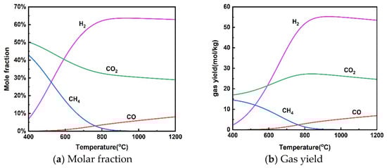Figure 2 shows the effect of reaction temperatures in the range of 400–1200 °C on gas molar fraction and gas yield at a pressure of 25 MPa and a rice straw concentration of 10 wt%. The effect of temperature on H2 production from the supercritical water gasification of rice straw is roughly divided into two stages, including a rapid increase in H2 at 400–800 °C and a smooth change from 800–1200 °C. Kang et al. [42] found that the average hydrogen production of various biomass SCWGs increased from 0.32 mmol/g to 1.85 mmol/g as the temperature increased from 450–650, but the trend of the average hydrogen production with increasing temperature slowed down when the temperature was higher than 550 °C. There was a significant decrease in CH4 yield in the gasification process and an increase in H2 yield when the temperature was increased from 400 to 800 °C. This change in gas composition can be explained by the properties of the reactions performed in supercritical water gasification. The methanation reaction (13) was inhibited at higher temperatures because it is exothermic. On the other hand, the reforming of methane was enhanced because it is a heat-absorbing reaction. Both processes result in a decrease in CH4 production and an increase in H2 production. Meanwhile, the enhancement of steam reforming (11) of the heat-absorption reaction with increasing temperature leads to an increase in H2 production. In addition, the water–gas shift reaction (12) was also inhibited at high temperatures due to its exothermic properties, reducing the conversion of CO to CO2 and H2. Therefore, CO content increased with increasing temperature. Lu et al. [43] found that temperature has the greatest effect on biomass supercritical water gasification using the orthogonal method because high temperatures support free radical reactions.
