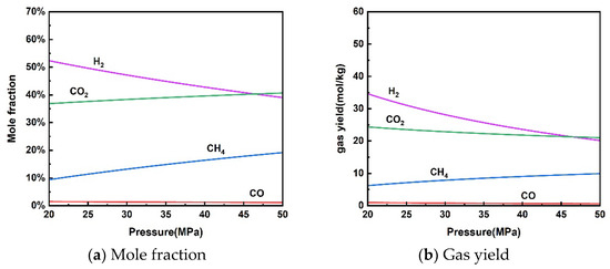 The effect of reaction pressure on the thermodynamic equilibrium of rice straw gasification in supercritical water is presented in Figure 3. As the pressure increased from 20 MPa to 50 MPa, the molar fraction of H2 and gas yield decreased from 52.33% and 34.62 mol/kg to 39.02% and 20.18 mol/kg, respectively. The molar fraction of CH4 and gas yield increased from 9.37% and 6.20 mol/kg to 19.16% and 9.91 mol/kg, respectively. Gas yields of CO and CO2 showed a slight decline. An increase in pressure promotes a shift in gas volume in the direction of decrease according to Le Chatelier’s principle of equilibrium shift. Therefore, the methanation reaction (13) moved in a positive direction making H2 production decrease and CH4 production increase. CO and CO2 changed very little due to the minimal impact on the water–gas shift reaction.