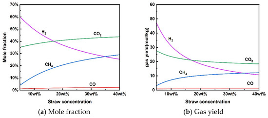 Figure 4 shows the reaction characteristics for the supercritical water gasification of rice straw at different concentrations. It is worth noting that no coke was produced in the concentration range examined under thermodynamic constraints. The results showed that the increase in concentration also had an inhibitory effect on H2 production by supercritical water gasification, which decreased the mole fraction and gas yield of H2. The opposite trend was observed for the molar fraction and gas yield of CH4. The increase in concentration increased the CH4 content in the produced gas. For a given temperature of 650 °C and pressure of 25 MPa, H2 was the most abundant gas at lower rice straw concentrations (<17 wt%). The gas yield of CH4 was higher than that of H2 when the concentration of rice straw exceeded 35 wt%. Thus, the increase in high rice straw concentration may facilitate the methanation reaction for the conversion of H2 to CH4 under thermodynamic constraints [46]. Huelsman et al. [47] investigated the gasification mechanism of different concentrations of phenol in supercritical water. High concentrations of phenol reduced hydrogen yield due to polymerization reactions, leading to deposition and coking. From a kinetic point of view, less water in the reactants may limit the contact between the material particles and water to reduce the reaction rate of SCWG, which is not conducive to total gasification [48].