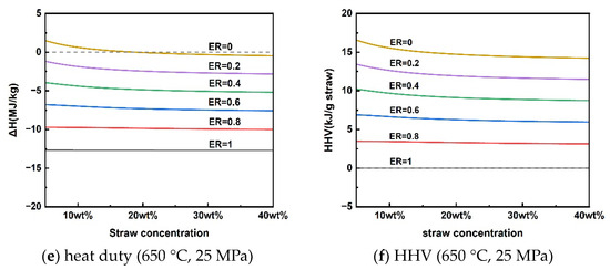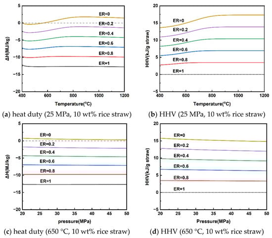 Clarifying the energy changes in the rice straw SCWG gasification process can facilitate energy matching to accelerate the reaction process, of which the reaction heat duty is an important indicator. Consumption of some of the hydrogen-rich gas can provide energy to the gasification process, as shown in Equations (16)–(18). This section analyzed the heat duty of the gasification process as well as the HHV of the gaseous products under different variations of reaction parameters by adding different levels of oxygen, i.e., the oxygen equivalence ratio (ER). The ER can be calculated using Equation (19), if the chemical formula of rice straw is assumed to be CxHyOz, according to elemental analysis of mass fractions. The simulation was calculated assuming an isothermal process and focusing only on the reaction process without including the heating process of the material and the preheated water.