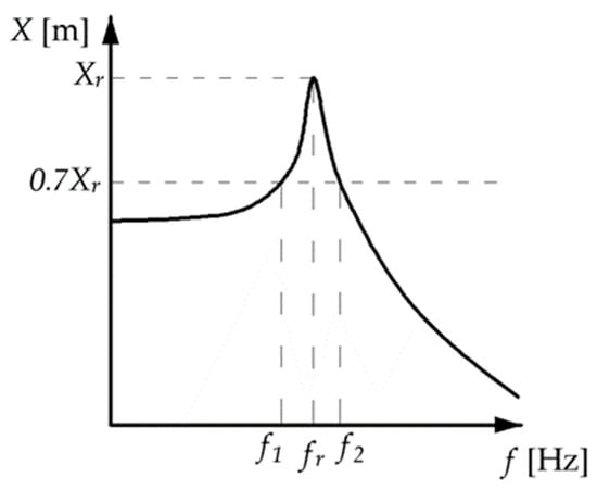 Schematic presentation of the half-power bandwidth method using the displacement spectrum. Xr—displacement amplitude, fr—resonant frequency, and f1 and f2—correspond to frequencies to 0.7 value of resonance amplitude.