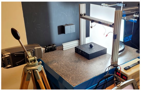 In the research using this method, an Olympus (Tokyo, Japan) I-Speed high-speed camera with a frame rate of 1000 fps was used. An electromagnet released by a toggle switch was used to free drop the steel ball. In order to ensure good contrast to the falling ball, the scene was illuminated using a high-performance nonflickering LED reflector. To standardize the lighting, a diffuser made of white matt plexiglass was used. The ball was dropped into the center of the sample surface in order to uniform the stress distribution in the sample. The measurement setup is shown in Figure 6. The diagram is shown in Figure 7.