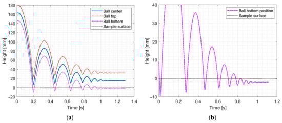 The height from which the ball was freely dropped was 180 mm. This height was chosen due to the capabilities of the camera lens and the ability to measurably observe the ball throughout its entire course. Another argument for this drop height was the possibility of recording the ball’s indentation in the material (local minimum of the ball’s position). In the case of preliminary tests at lower drop heights, there were problems with registering the local minimum. At higher altitudes, the speed of the ball falling right after the collision was so high that the error in determining the position of the ball at a given number of frames of the recorded image increased significantly.
