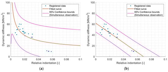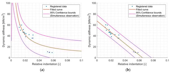From the data included in Table 6 it can be concluded that the first relative indentation to dynamic stiffness correlates best. However, this raises some doubts, because a linear function has a zero crossing (unless it is constantly positive) and also accepts negative arguments (which would mean that relative indentation can be negative). For this reason, it is worth considering another function describing the relationship between relative indentation and dynamic stiffness. As an alternative to the linear function, one can propose the rational function or power function, which is characterized by asymptotic behavior. The analyses show a better R2 for the power function, which was (however) still not satisfactory (R2~0.5). The matching results are shown in Figure 9.