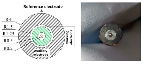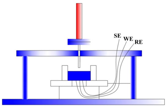 The electrochemical experimental setup for particle impact is illustrated in Figure 2. An electrochemical workstation PARSTAT MC-1000 was used to test current changes (Ametek. Co., Ltd., Berwyn, PA, USA). An AgCl-saturated calomel electrode was employed as the reference electrode, and graphite served as the auxiliary electrode. The graphite electrode area was 20 times larger than the working electrode. The 304 stainless steel was used as the working electrode because its surface can be easily passivated. The saturated calomel reference electrode, which was placed in the test chamber, was connected to the standard three-electrode system. A long platinum wire was used as the counter electrode. For electrochemical monitoring, polarization curves were recorded by changing the electrode potential at a sweep rate of 0.2 mV/s.