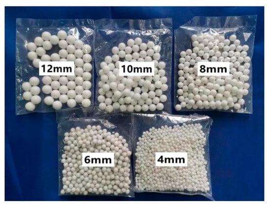 Two media were utilized in the experiments: H2O and H2O + 3.5 wt% NaCl. The jet nozzles had diameters of 10 mm and 15 mm, respectively. The particle impact angle was set to 90° to maximize the acceleration of reactant mass transfer. Single particle impact experiments utilized large-diameter spherical plastic particles made of methyl methacrylate (PMMA), characterized by their large diameter and low density. The large diameter maximizes disturbance of the mass transfer boundary layer and disrupts corrosion product films. The diameters used were 4 mm, 6 mm, 8 mm, 10 mm, and 12 mm, with a density of approximately 1200 kg/m3, as depicted in Figure 3.