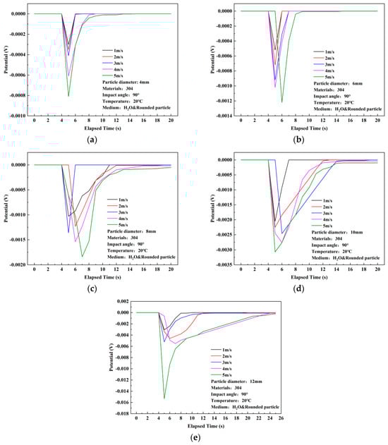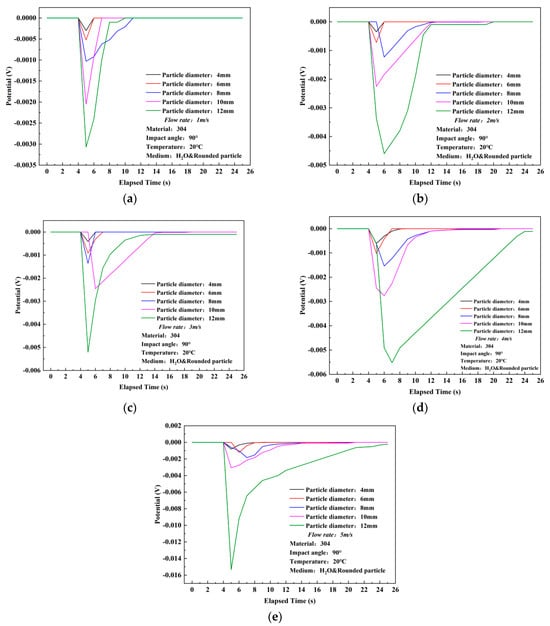 Experimental results of potential variation of 304 stainless steel under single particle impact in distilled water (flow rate comparison). (a) 4 mm, (b) 6 mm, (c) 8 mm, (d) 10 mm, (e) 12 mm.