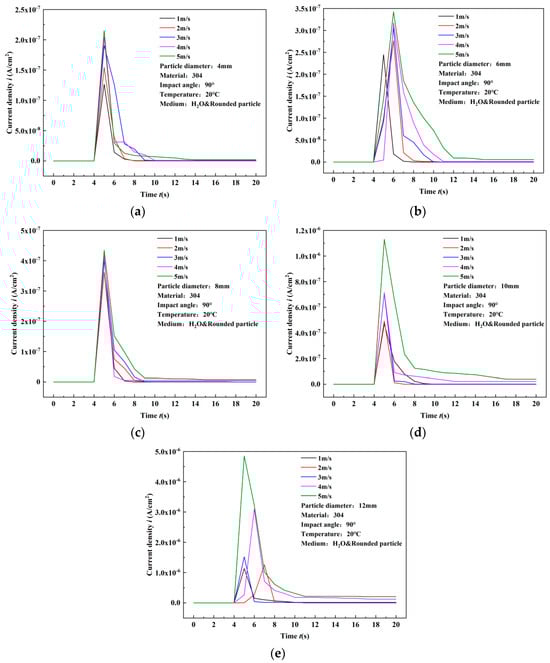 Experimental results of surface current density variation of 304 stainless steel subjected to single particle impact in water (comparison of flow velocities). (a) 4 mm, (b) 6 mm, (c) 8 mm, (d) 10 mm, (e) 12 mm.