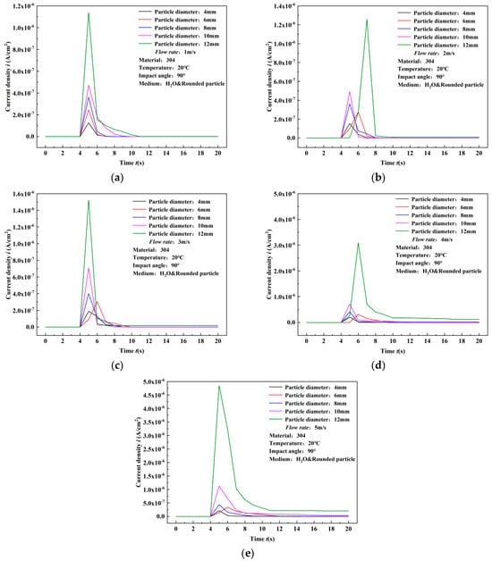 Figure 7 illustrates the peak current density under different particle diameters at the same flow velocity. Comparative results show a noticeable increase in current density peak values with the enlargement of particle diameter at each flow velocity. When the flow velocity is 1 m/s, the current density peak values for particle diameters of 4, 6, 8, 10, and 12 mm are, respectively, 1.27 × 10−7 A/cm2, 2.45 × 10−7 A/cm2, 3.62 × 10−7 A/cm2, 4.71 × 10−7 A/cm2, and 1.14 × 10−6 A/cm2. With every 2 mm increase in particle diameter, the percentage increase in current density peak values is 92.91%, 47.76%, 30.11%, and 142.04%, respectively. The largest increase occurs between diameters 10 mm and 12 mm, representing an order of magnitude increase, indicating a nonlinear growth relationship between current density peak values and particle diameter. Similar trends in variations are observed under different flow conditions. This phenomenon is attributed to the cubic relationship between the diameter of spherical particles and their volume, which is proportional to the volume. Consequently, with constant particle density, the volume undergoes nonlinear changes, resulting in nonlinear changes in particle mass, and, subsequently, the impact energy of particles exhibits nonlinear amplification. Furthermore, with the increase in flow velocity, the time required for the surface current density peak value of 304 stainless steel to recover to its initial value also increases. Therefore, the variation in current density peak values with particle diameter becomes more significant. The highest increase occurs at a flow velocity of 5 m/s, where the current density corresponding to a diameter of 10 mm increases from 1.13 × 10−6 A/cm2 to 4.85 × 10−6 A/cm2 for a diameter of 12 mm, representing a percentage increase of 329.12%.