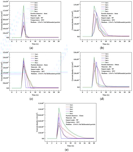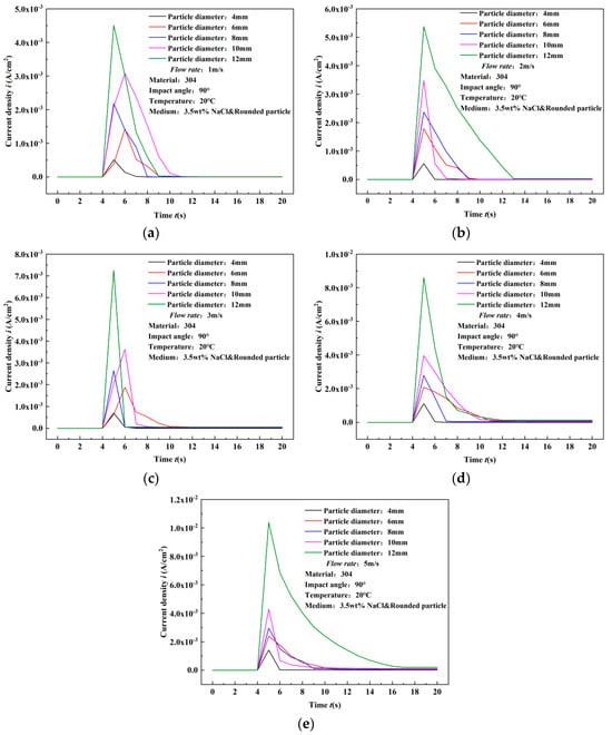 Experimental results of surface current density variation of 304 stainless steel under single particle impact in 3.5 wt% NaCl solution (comparison of flow rates). (a) 4 mm, (b) 6 mm, (c) 8 mm, (d) 10 mm, (e) 12 mm.