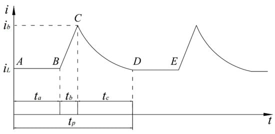 After metal is impacted by particles in a liquid–solid two-phase flow, the metal surface is exposed to the corrosive medium. The electrochemical reaction system on the surface experiences transient disturbances but eventually stabilizes. The electrochemical reaction current density is positively correlated with the corrosion rate. Following particle impact, the trend of current density variation is depicted in Figure 10.