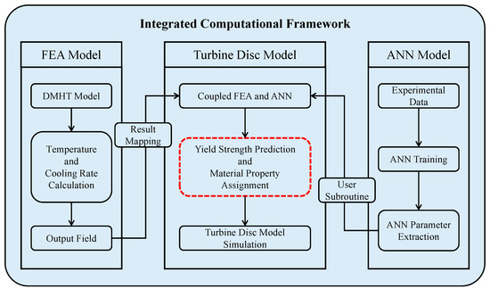 Considering the distinctive characteristics of the disk component, which exhibits varying mechanical properties across different regions, traditional finite element simulations often rely on homogenized temperature-dependent and strain-rate-dependent material properties. However, these methods fail to represent accurately the variation of material properties on the workpiece. To address this issue, this study proposes a material property assignment approach. Based on the heat treatment information for each element of FEA, material properties were calculated using the ANN model and subsequently assigned to each finite element. This coupling of ANN and FEA allowed for a precise depiction of content mechanical performance distribution across the component. The integrated computational framework of ANN and FEA is depicted in Figure 1, with the ANN model and FEA results having been established in prior research.